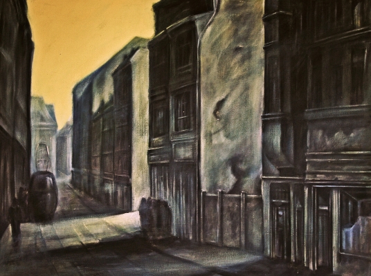 Geiststraße in Halle, 1987, Temperafarbe/ Ölfarbe auf Leinwand, 100 x 130 cm