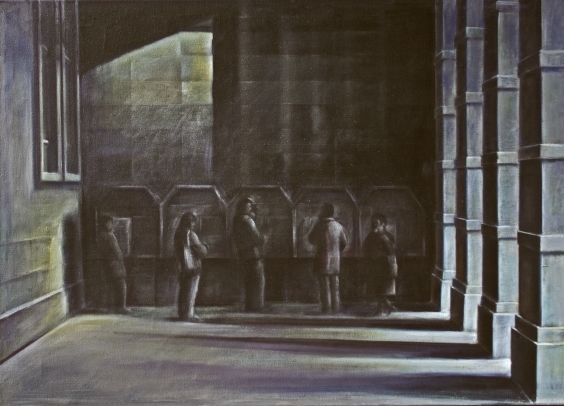 Öffentliche Telefonzellen am Rathaus, 1986, Ölfarbe auf Leinwand, 100 x 145 cm